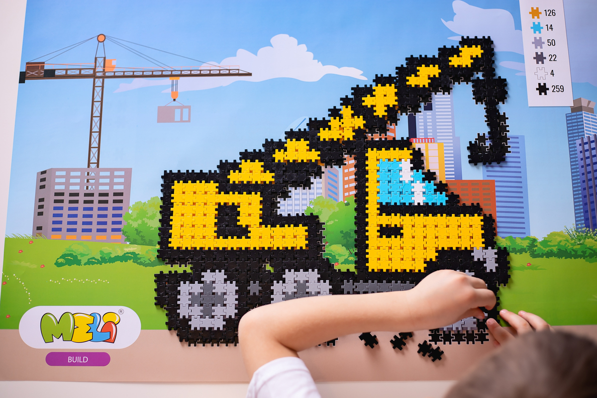 Este completo set incluye 500 piezas en colores amarillo, azul, gris y negro, cuidadosamente seleccionados para recrear con realismo el mundo de la construcción. Con la ayuda de dos plantillas incluidas, los niños pueden seguir modelos guiados para montar la maquinaria o dejar volar su imaginación y diseñar sus propios vehículos de obra, explorando posibilidades ilimitadas de construcción.