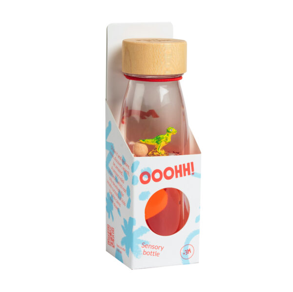 El rey de los dinosaurios ha salido de su huevo para bailar majestuoso dentro de la Botella Sensorial Move T-Rex – Petit Boum. Una experiencia sensorial fascinante que combina movimiento, color y calma para transportar a los pequeños a un universo de fantasía y serenidad.