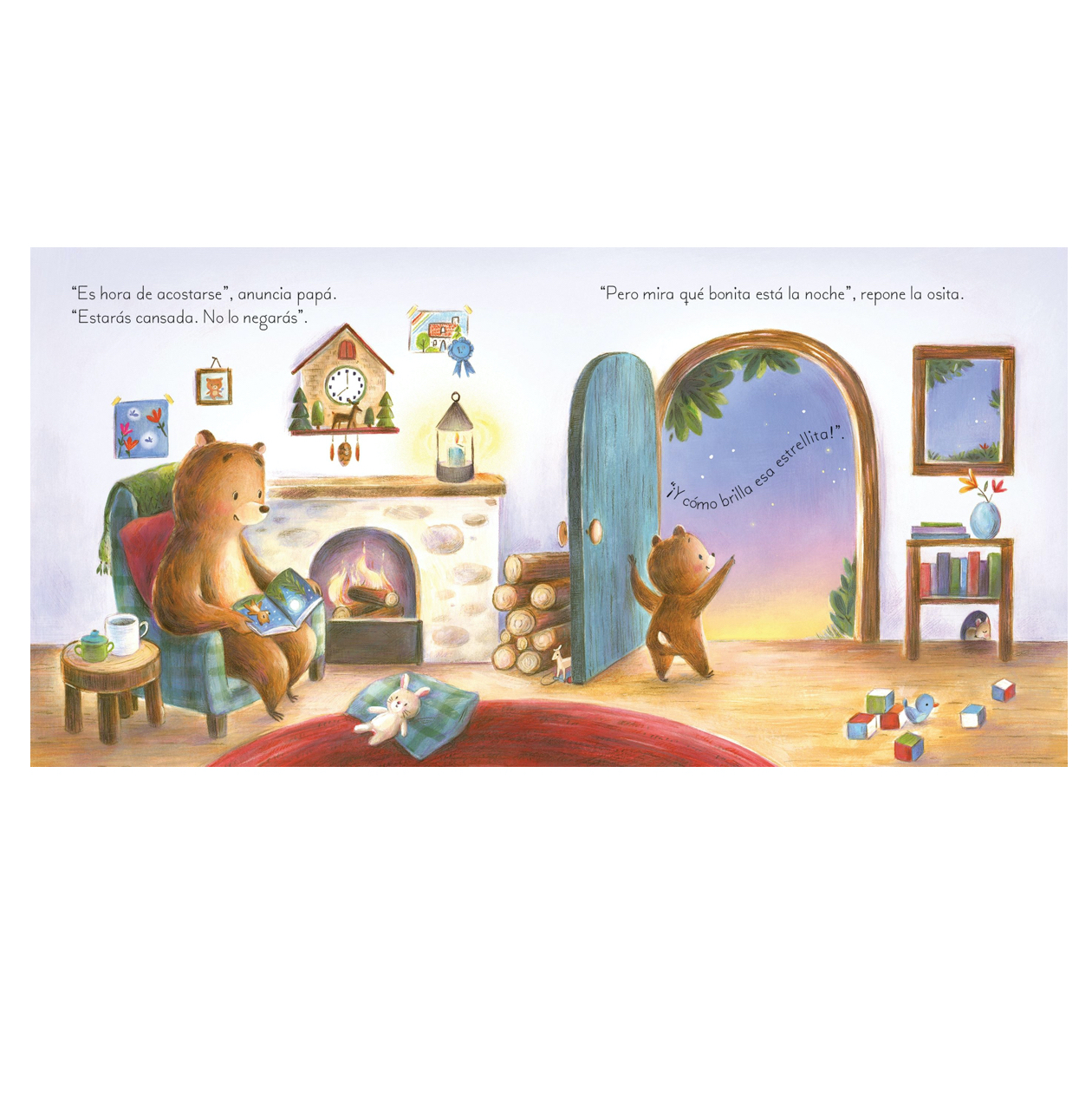 Pero el pequeño osito no puede dejar de mirar el cielo estrellado. Acompaña a este tierno personaje y a su papá en un mágico paseo nocturno lleno de calma, ternura y luces brillantes.