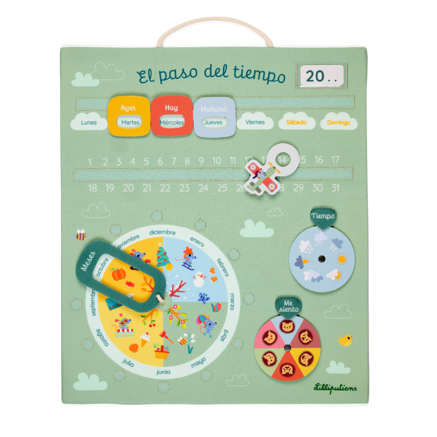 El Calendario El Paso del Tiempo Catalán – Lilliputiens es una herramienta lúdica y pedagógica diseñada para que los niños a partir de 3 años aprendan a orientarse en el tiempo, comprendan el paso de los días y expresen cómo se sienten.