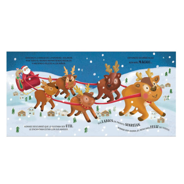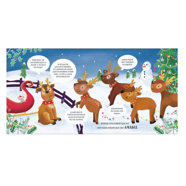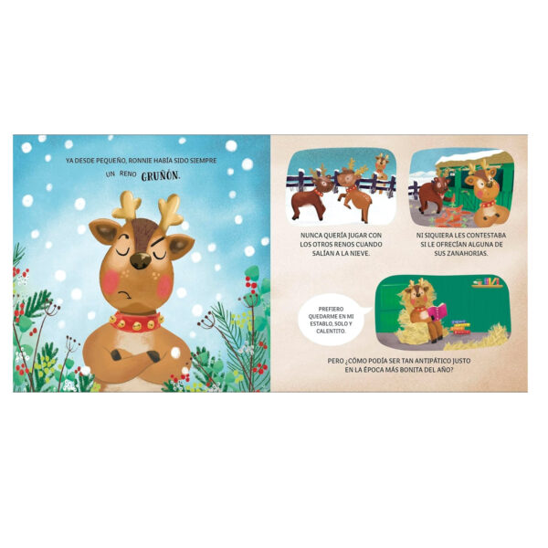 En esta mágica historia, conocemos al reno gruñón, un personaje que no disfruta de las fiestas como los demás. Mientras todos los renos celebran felices, él refunfuña y resopla, alejando a quienes intentan acercarse. Pero cuando Papá Noel le pide ayuda, el reno comprende que estar solo no es tan divertido y que la verdadera felicidad se encuentra en la compañía, la amistad y el cariño compartido.