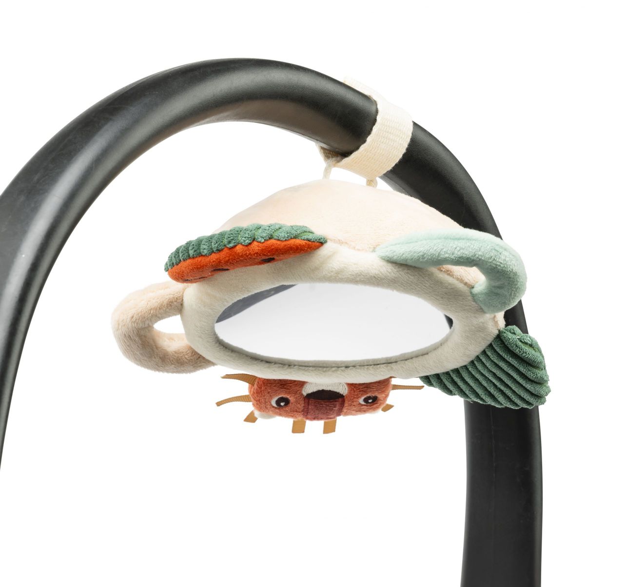Colocado boca abajo, el bebé se divierte observándose en el espejo mientras interactúa con los pequeños juegos que lo rodean, favoreciendo el desarrollo sensorial y la motricidad. Además, gracias a su práctico lazo, puede colgarse fácilmente para acompañar al bebé en diferentes momentos y espacios.