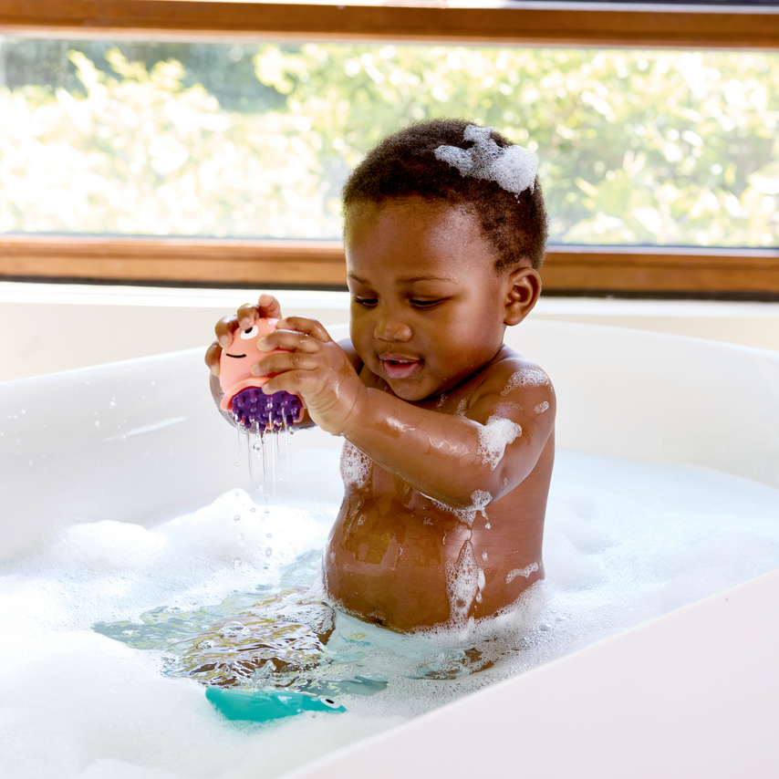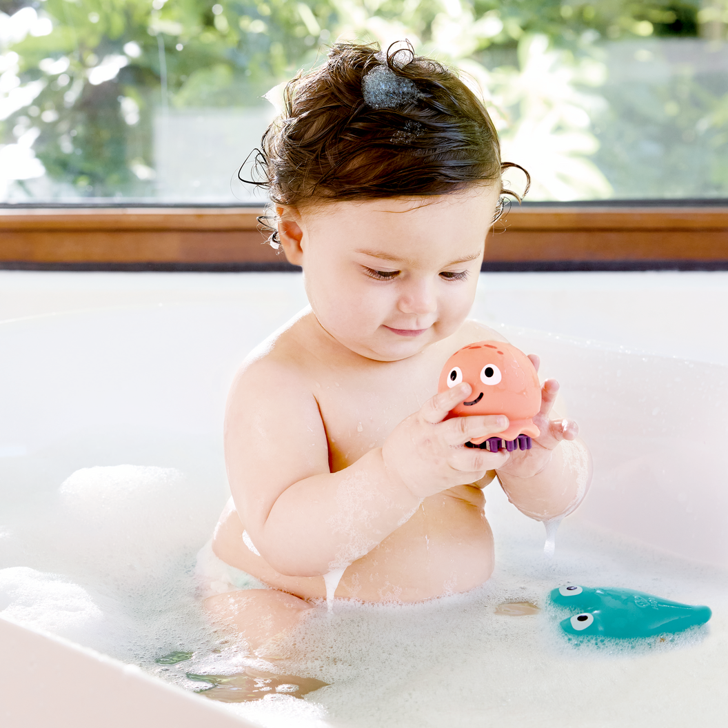 El set de Lanzadores de Agua Animales Marinos – Hape incluye una suave manta raya y una medusa flotante con formato de apretar y lanzar agua, ideal para manos pequeñas. La medusa incorpora además un delicado cepillo masajeador que aporta una agradable estimulación sensorial durante el baño.