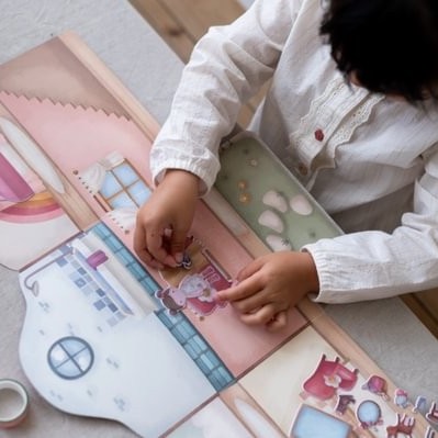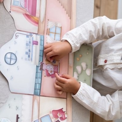 El Libro Pegatinas Crea tu Historia House – Little Dutch es una propuesta creativa que permite a los niños diseñar y narrar sus propias escenas inspiradas en el hogar de la muñeca Rosa. Con esta actividad, estimulan la imaginación y el juego simbólico.