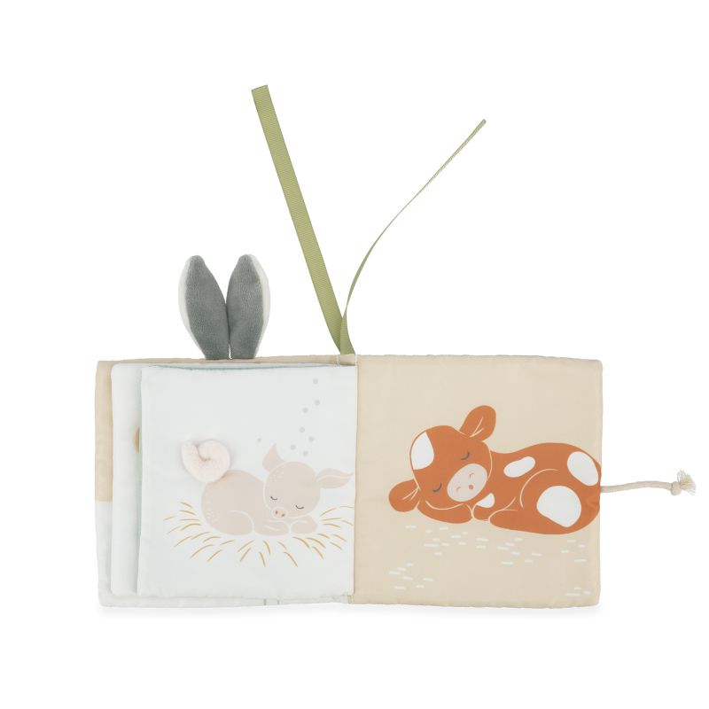 Libro de tela suave y colorido con ilustraciones tiernas, distintas texturas y pequeñas actividades para estimular la vista y el tacto.