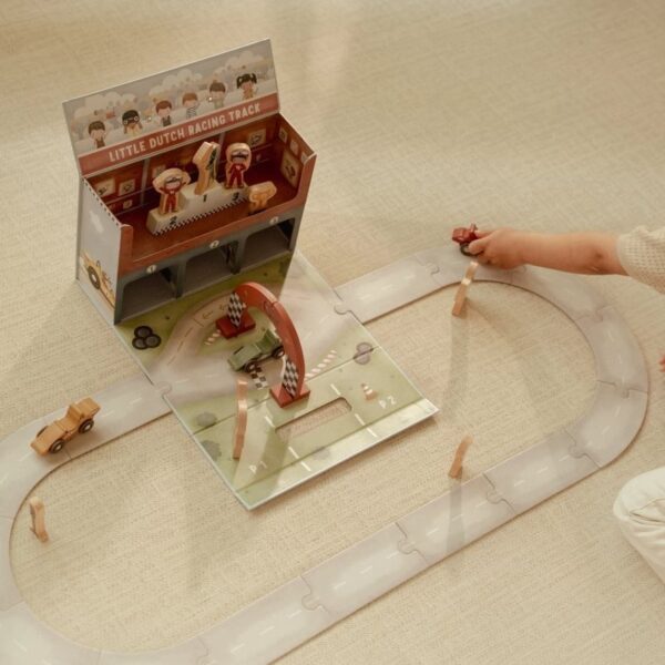 El Maletín Pista de Carreras – Little Dutch incluye todo lo necesario para organizar una carrera emocionante: coches de carreras, pilotos, una línea de meta, señales de tráfico, un trofeo y un podio para los ganadores. Cada detalle está cuidadosamente diseñado para que los niños puedan recrear sus propias competiciones, imaginar historias y desarrollar habilidades sociales mientras juegan.