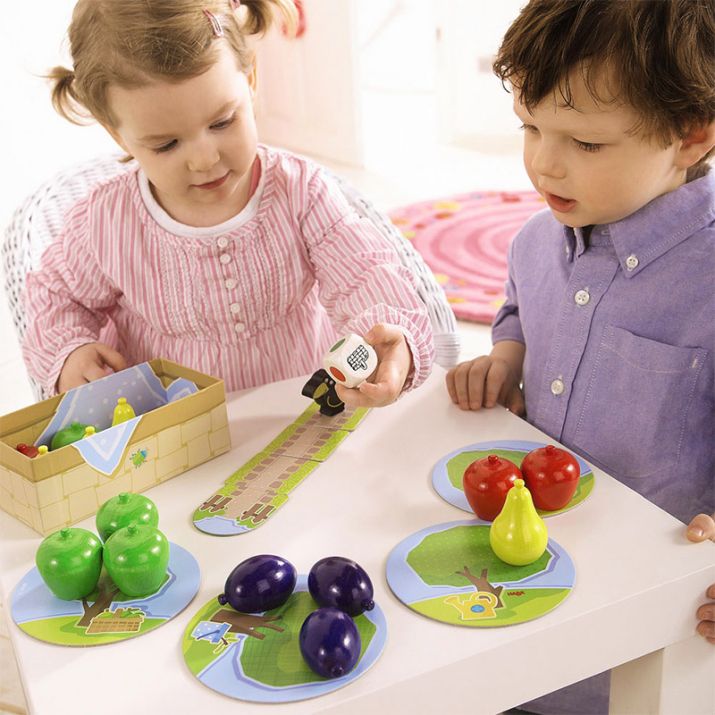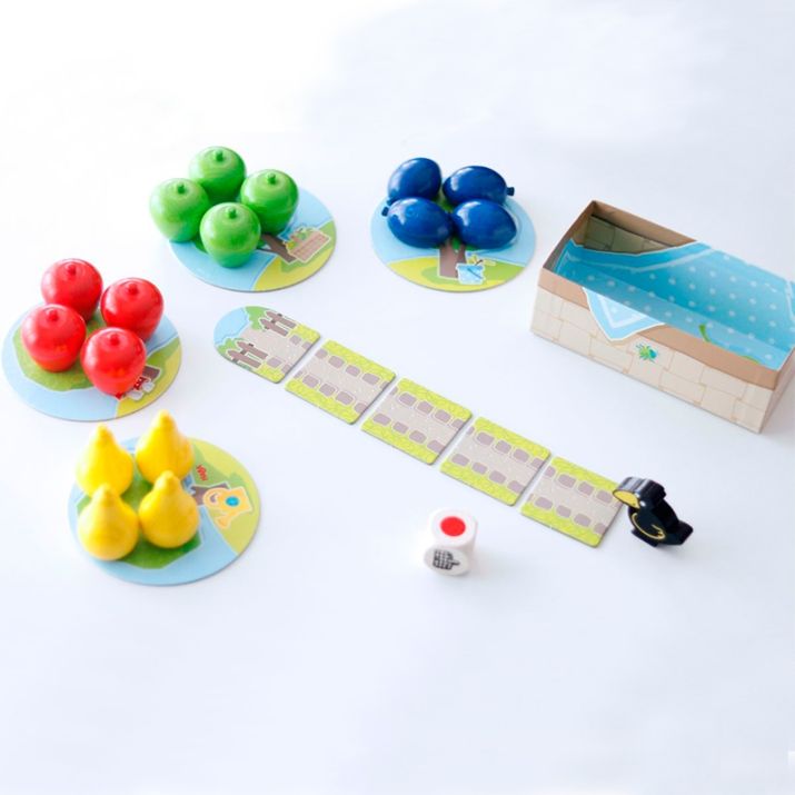 La mecánica es sencilla y muy entretenida: cada jugador tira el dado de colores y deberá recolectar la fruta que corresponda en su árbol. Pero cuidado, si aparece la imagen del cuervo, este avanzará un paso hacia el frutal. ¡El reto será recoger todas las frutas antes de que el cuervo llegue al jardín!