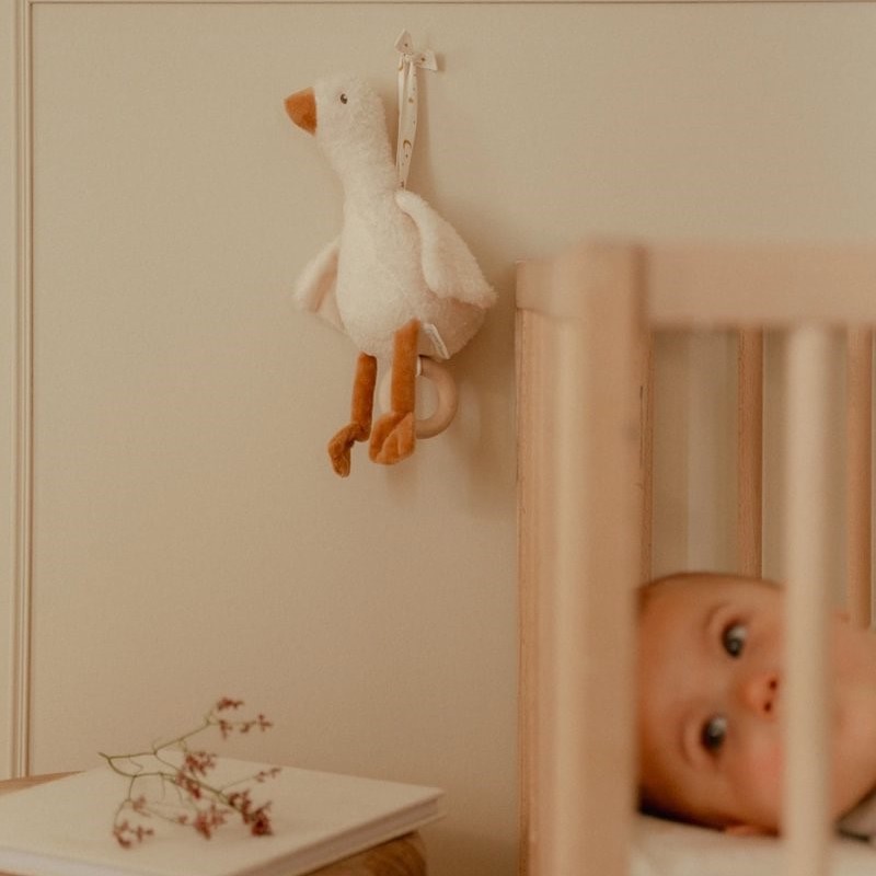 La Oca Musical New Born – Little Dutch es un detalle decorativo lleno de ternura, perfecto para regalar o completar la habitación del bebé con un toque mágico y relajante.