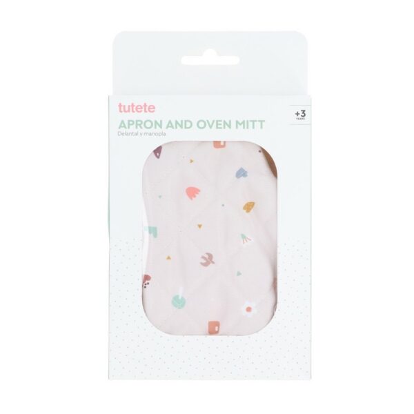 La manopla, a juego, incorpora un asa para colgar en la cocinita o en el gancho de la cocina, fomentando el juego simbólico y la imitación de los adultos. Es importante recordar que se trata de un accesorio de juego, no destinado a la protección real frente al calor o al frío.