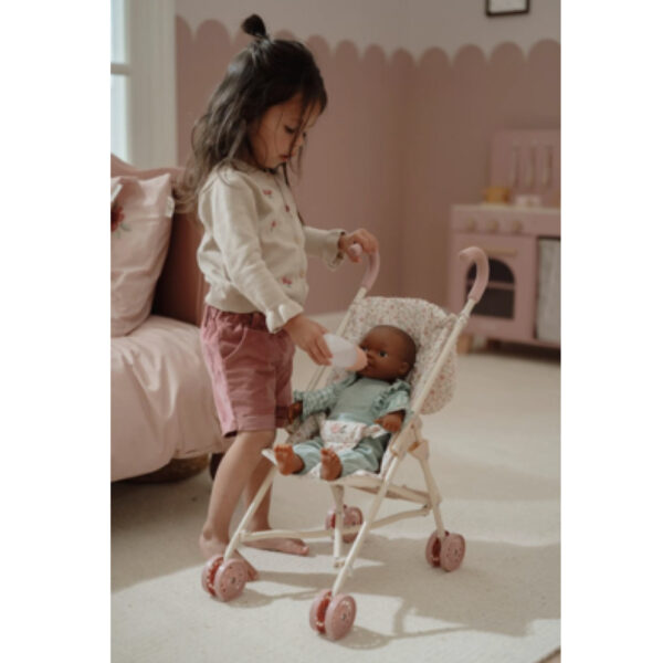 Su asiento acolchado luce un precioso estampado floral y cuenta con un cinturón de seguridad para que el muñeco viaje cómodo y protegido. Además, el carrito de paseo incorpora una bolsa a juego ideal para guardar accesorios o pequeños tesoros, lo que lo hace aún más realista y práctico.